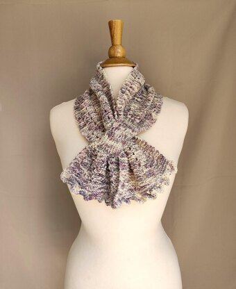 Add on a little pizzaz with this not-exactly-frilly scarf, the perfect combination of comfort, color and style. Lacy scallop loops accent the hem and the main body is worked in a squishy garter stitch lace. Both the stitch work and smooth, hand-painted yarn make this an enjoyable knit.