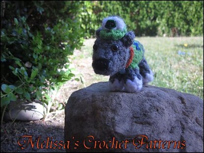 You will need… All yarns used are Red Heart Super Saver Solids unless specified otherwise Red Heart with Love Solids in Pewter Spring Green White Carrot for collar Blue Suede for small part of body Small amount of black yarn for nose 1 Pony Bead for collar 6mm safety eyes 3.25mm crochet hook (Size D) Black Fabric Paint for hat (I used Tulip Puffy Paint) Green Paint for hat (or desired color) Fiberfill Stuffing Yarn Needle Sewing Pins to hold pieces in place before sewing (optional) Stitch Markers