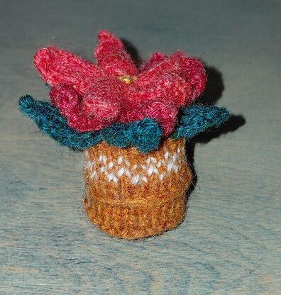 This 7 cm poinsettia was knitted on 1.25 mm double pointed needles (UK 18, US 0000) in Scheepjes Metropolis (016) Karachi, (043) Naples, (044) Darwin, (065) Liverpool and (030) Toulouse. It has been knitted on thinner needles than recommended for the yarn, to give it a denser fabric. All can be done in heavier yarn, on thicker needles and the plant will turn out somewhat larger. It's a medium project with knitting flat and in the round and intarsia work.