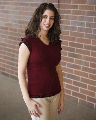 The Polaire Tunic is inspired by the straight 1920's silhouettes, updated with some waist shaping. Knit in a drapey sport-weight yarn, this cool spring top adds just a hint of femininity with scalloped lace at the hem and armholes. Eyelet trim finishes the modified V-neck, flattering on so many figures. Perfect as a light spring top or for a holiday party.