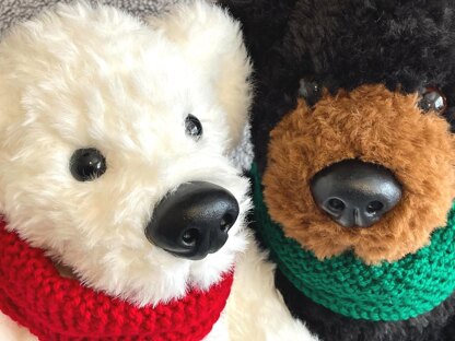 I have designed Polar and Grizzly Bear Cousins specifically for super chunky faux fur yarns, a bit more than super chunky in my opinion. I have included links to these yarns on the pattern. If you wish to use thinner yarns please adjust your needle size to at least 2 sizes smaller than recommended needle size on the ball band. Polar and Grizzly Bears are designed to stand and measure 16 inches/41cm from head to toe. A perfect bear for a child’s best friend. He is knitted flat, feet, legs and body are knitted as one piece, head, ears, arms and tail are knitted separately. I have included a step by step assembly guide which is full of photos, hints and tips to help you create a perfect bear.