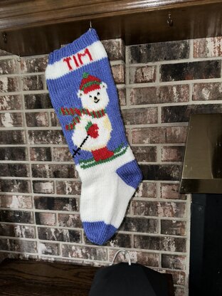 Pattern includes: Written stocking instructions, alphabet chart, hints and a color chart of the design. Intermediate knitting. Need basic knowledge of intarsia knitting. Gauge is 18 sts and 24 rows =4” No gauge required finished size approximately 7” x 23” Knitted Flat and sewn up back seam