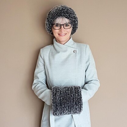 The hat is knitted in one piece in rounds bottom up. The muff is also knitted in one piece in rounds. The muff is available in two different sizes. The small version (like the sample) and a wider version to have mor space for your hands.