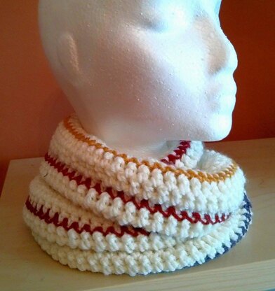 Last winters buzz word was Polar Vortex. This infinity scarf is designed to match the Polar Vortex hat. Instead of the dips, I simply added a stripe of each colour to blend well but not over power the design in the hat. I made this scarf with 100% wool in worsted weight (4). You could replace with any worsted weight, however wool will keep you warm! You could try a Merino or Superwash!