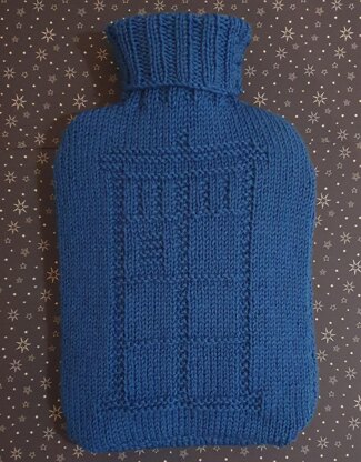 Inspired by the TV series Doctor Who this hot water bottle cover shows a 1950s police box created by knit and purl stitches without any colour changes! It's designed to fit a standard 2 litre hot water bottle and has openings both at the top for easy filling and at the back so the bottle can be removed. It's knitted flat in 3 pieces which are then sewn together.