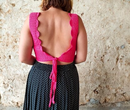 The Sunny Day Top will become your staple top to welcome Spring. It’s a comfortable cropped top with an open back and with a classy scallop edging and a belt that can be tied at the back or front.