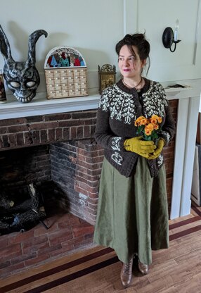 This is a pattern for a stranded colourwork sweater worked in the round and from the top down and with a steek. Poppy Pods also has afterthought pockets set with waste yarn and a chart for working Duplicate Stitch patterning. There are no specific instructions for waist shaping, but you may work it as you prefer. The yoke, sleeve, and pocket motifs are charted.