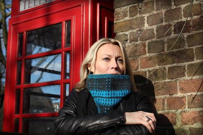 The Portcullis Cowl is a short circular cowl, just perfect for throwing on around your neck, and letting it cuddle you in a cosy, warm knitted hug. It features two contrasting colours of squishy yarn, and an attractive banded design that enhances the elegance and line of your neck. It can be worn rolled, or standing up, depending on your mood, and it even looks pretty good inside out, giving you the chance of a whole new look!