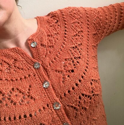 This pretty cardigan features a circular/round yoke with delicate overall lace and eyelet pattern. This cardigan is worked seamless from the top down, body is worked flat and the sleeves are later picked up and worked in the round. Buttonband is added last.