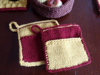 The potholder is done in double knitting, with an extra flat knitted piece that is folded and sewn to the main body (thus creating a pocket for the hand) , and along the edge is attached an I-cord. Finished Size: Potholder is 6” / 15.5 cm wide and 6” / 15.5 cm long.