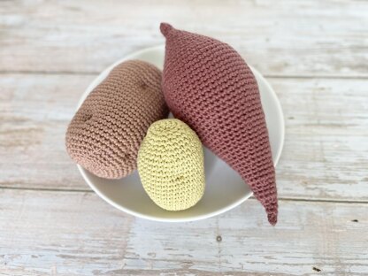 This potato trio crochet pattern is about to produce some adorable, realistic and eco-friendly amigurumi toys! The pattern includes the method for 3 different varieties of potato: Russet, Yukon/Golden, Sweet Potato/Yam. These spuds will be a great addition to your little one's sustainable crochet fruit & vegetable toy collection.