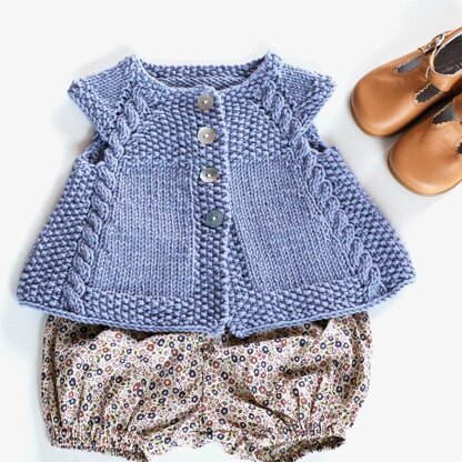This cardigan is knit seamlessly from the top down. Stitches for the cap sleeves are bound off, then the fronts and back are worked flat, then joined again and worked in one piece to the hemline. A simple cable pattern follows the raglan lines and continues into the body, gradually flaring out. The button bands are worked as you go.