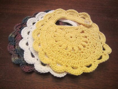 Finished bib (after washing and drying) has a 9 ½ inch diameter and a 10 inch neck opening. Size can be adjusted easily by using a larger or smaller hook, or by substituting a different weight yarn.