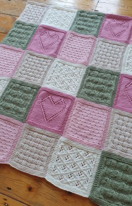 An easy to knit patchwork blanket, constructed by knitting 4 or 5 strips of textured patches which are then sewn together to form the finished blanket.