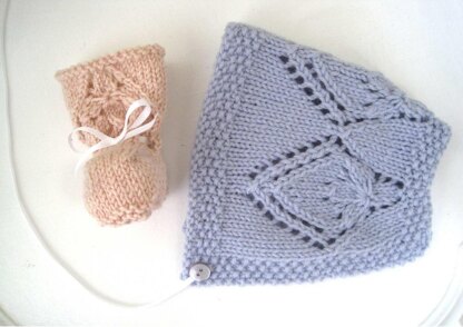 A gorgeous bonnet & booties set designed to match all of the dress patterns in The Pretty Petal Dress Collection and Cardi patterns in The Pretty Petal Cardi Collection