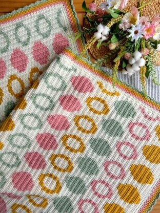 The Pretty Polkas blanket features a fun design worked in tapestry crochet. The yarn is carried across the rows, making it even more cosy and also features a beautiful moss stitch and scalloped border.