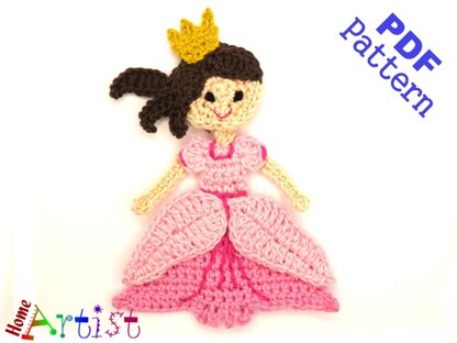 Pricess measures about 5 in. in height by 3 in. wide but the size can be varied by using thinner or thicker yarn and types of hook. Colors can be changed according to your personal preference. The pattern is designed for worsted weight yarn and uses American English crochet terms.