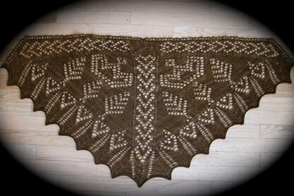 The Princess Cottongrass shawl is knit in a brown colour that captures the colour of the tree trunks in the forest, and the colour of Princess Cottongrass' companion, Long-Leg Leap. The colour Woodsy was especially created for this shawl by Roxanne at Zen Yarn Garden. The central motif on the shawl shows the trees in the forest, the Princess' crown, and then her lost heart.