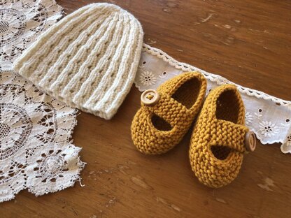A pretty lace rib beanie with golden garter stitch shoes… an easy knit pattern for newborn gifts.