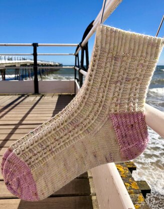 These socks were inspired by a recent trip that we took to the seaside. The town we visited has a wonderful Victorian pier, and a fenicular railway that descends down the cliff to the beach.