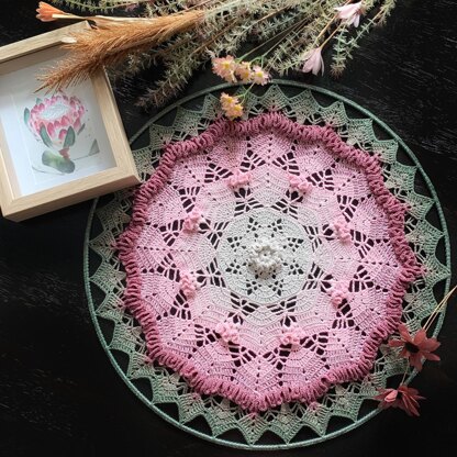 Protea is a highly textured flora inspired mandala. It can be used as a table centre piece or a wall hanging. Protea is an intermediate level pattern that requires a little concentration and counting