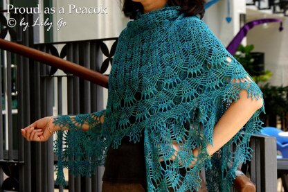 Proud as a Peacock is a deep triangular shawl that can be made with only one skein of lace yarn This shawl is crocheted from the neck down, and can be adjusted very easily depending on the amount of yarn you have. As with all my other patterns, this pattern comes with row-by-row written direction in US crochet term and charts.