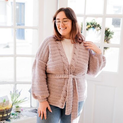 The Prue Cardigan is a belted cardigan with cable detailing around the neck and down the centre back. With balloon sleeves and a neat ribbed cuff around the wrist, this cardigan is about to be your new favourite make.