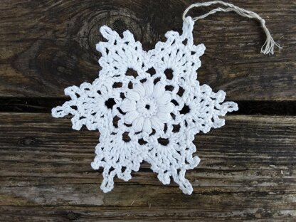 The snowflake ornament you can make by following this pattern will be approximately 15 cm (5.9 inches) in diameter.