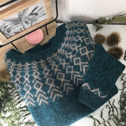 Le pull Heather est un pull en top down, tricoté en rond sans couture. Il est composé d’un empiècement jacquard géométrique qui mettra en valeur vos jolies laines et d’un joli motif de rappel sur les manches et le bas du corps. Le modèle présenté est réalisé en laine fingering doublée mohair pour un pull doudou qui vous accompagnera tout l’hiver, vous pouvez cependant le réaliser en laine type DK pour un effet moins poilu.
