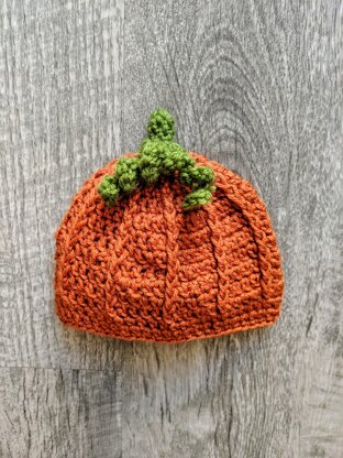 This hat is designed to look like a textured pumpkin with Fall leaves and vines on the stem - instructions given in pattern. This hat is worked top down with no sewing.