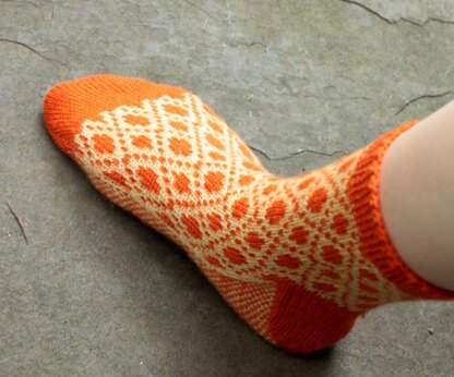 A stranded sock featuring two slightly different diamond patterns combined for an interesting geometric effect. A checkerboard pattern creates a cushioned sole and a slipped-stitch heel looks tidy and is simple to work. Using two solid colors, this pattern is great for showcasing team colors, House colors or your favorite colors. Substitute a variegated yarn for one color for a unique effect. Sock is worked from the toe-up, and the pattern is written for working on 2 circular needles.