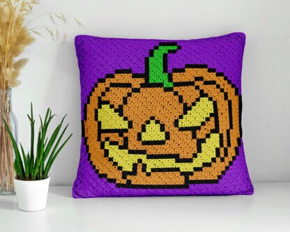 Purple cushion, made using the mini-C2C crochet technique. Pixel design features a classic grinning jack-o'-lantern—perfect for adding festive spirit to your couch, chair, or seasonal display. A fun and quick project for Halloween lovers who enjoy decorating with handmade, cozy touches.