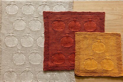 These cotton washcloths are worked up using a combination of knits and purls to create an outline of pumpkins throughout. The dish towels are reversible, but look the clearest from the right side. They can be knit up in 3 sizes varying from washcloth to dish towel. The written instructions are on pages 2-3, and if you prefer to see a chart for the motif there is a chart for the pumpkin outline on page 4. These are perfect home decor for Halloween, Thanksgiving and beyond.