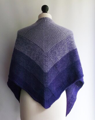 This fade triangular shawl is worked holding two strands of yarn together, then changing a strand every section to produce the fade from light to dark. Garter stitch, centered squares, add interest, with simple increases.