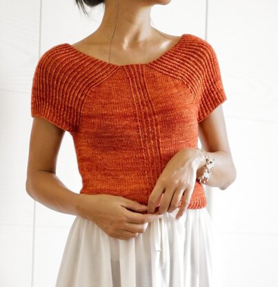 Pyramid in-the-round is a tee version of my design Pyramid Cardigan. Despite the similar look, this pattern shares little in common with the original design. It has a wider neckline, a different yoke shaping and is worked in a lighter weight yarn. It is worked seamlessly from the top down.