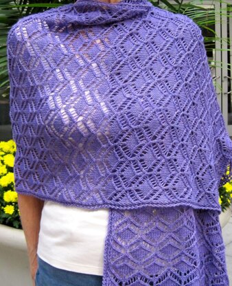This is a pattern for a lightweight wrap. It is the ideal weight for a spring or fall evening, or even if you’re sensitive to air conditioning in the summer. It is made up of lace stitch that is a true lace, open in parts, and very dimensional in other parts of the stitch. The lace stitch, which is one of the lessor known ones, is both written out line by line, and charted. The final size is 21 inches by 72 inches. There are instructions contained within the pattern for making it more dimensional, and increasing the size, should you want to. There are also instructions for an optional crocheted edging contained within the pattern, should you want it edged.