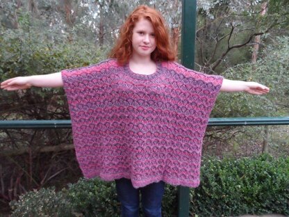 The Quadrangle Poncho is a wool blend poncho, worked bottom up in a lace pattern in two simple sections, with neck shaping for the front only.
