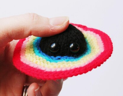 What you will need: 2 knitting needles (US3/3.25mm or as per tension advice), 5-10g double knit (DK) black yarn (e.g. Sirdar Snuggly DK 312), 10g DK yarn in various colors for the accretion disk, 2 black toy safety eyes (9mm), Polyfil toy stuffing, 1 tapestry needle for finishing, Electric iron or fine blocking wire and pins