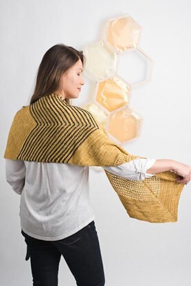 Honey Bee Wrap is an arrow-shaped wrap, pointy at one end and V-shaped at the other end. It is knit in sections (like a sampler shawl) with some easy, mindless stitches like garter and stockinette, and interspersed with interesting sections of bobbles, honeycomb lace and stripes.