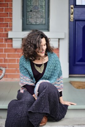 A fabulously substantial shawl, Queenie is knitted from the top down in a scooped triangular shape. She incorporates oodles of texture, seductive lace, and a beautiful variety of soft yarns, and she looks fantastic cuddled around your neck or draped over your shoulders.