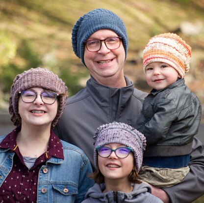 Choose your yarn, and enjoy making this one — you will likely get asked to make more than one. The hat is shown in 4 different yarns, with slight variations in fit and shape.