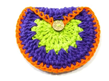 This bag is constructed in 2 sections, a front section and back section and joined together around the edge. The purse is completed in an 10 ply cotton aran.