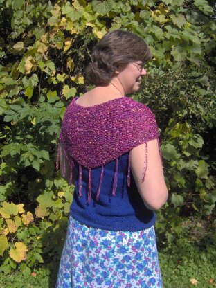 This is a fun little shawlette. It can be made with ladder yarns, furry yarns, mohair or any other yarn or combination of yarns you would like to try. It can add warmth or just a little bit of flash to your outfit.