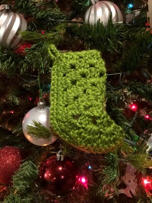 This modified, granny square folds nicely into a stocking just right for little goodies, hanging on the tree, or stringing together into a festive garland.