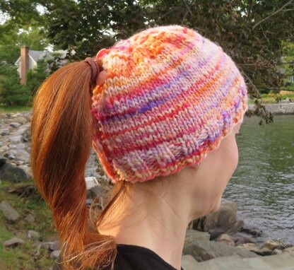 This fun ponytail hat knits up in a flash! It has buttons on the back so you can wear your ponytail (or bun) high, low, or in between. Just undo a button wherever you like to position your ponytail, or undo two buttons for a bun.