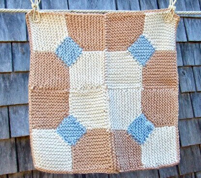About The Design Whenever I need design inspiration, I tend to look to other textiles. Simple (and some not very simple) geometric patchwork quilt blocks translate easily into knitting, especially in garter stitch.