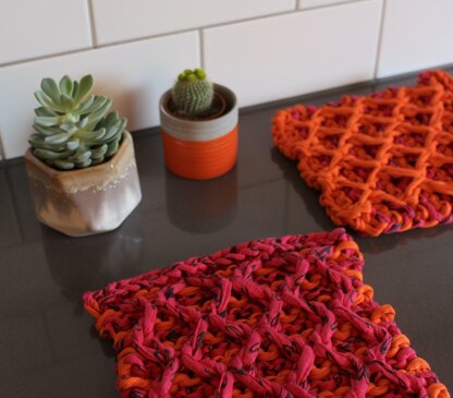 These vibrant, chunky hot pad stands will bring a great zing into your home. The slipped stitch pattern creates a relief layer that makes these super thick and the ultimate protection for any surface. The hot pads lie beautifully flat and are worked on a Garter Stitch base which makes them naturally reversible.