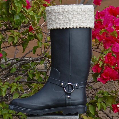 This boot liner is perfect for keeping feet cozy on a rainy day. It is knitted in the round with an easy Quilted Lattice stitch pattern cuff and Stockinette stitch body. Stirrups on the bottom keep the liner from riding up. Pattern is adjustable for boots with a range of shaft heights.