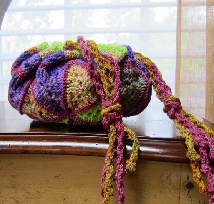 This project bag is formed by making 24 triangles and then arranging them in a hexagonal shape. Single crochet the triangles together, and then continue to add rows to the top of the bag to give it additional depth. Loops are created at the top, and four cords of double crochet are woven through the loops to create drawstrings. I made the bag using six different colors of Koigu, and when I finished, I had a little less than three hanks left. So, I think one can use fewer colors and make the bag with four hanks of Koigu. This bag would be a great way to use up remnants of sock yarn. Each triangle took about 9 and 1/2 yards of yarn to complete. The bag is sturdy and easily holds a small or medium-sized project.