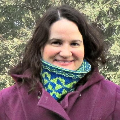 The cowl begins with a two-color long-tail cast-on and ends with a matching stem-stitch sewn bind-off in the contrast color. The top and bottom borders are striped, but the broken rib creates an interesting blip, perhaps Don Quixote's heartbeat for his beloved Dulcinea. The body of the cowl features a tessellating windmill pattern in two colors of worsted weight yarn.